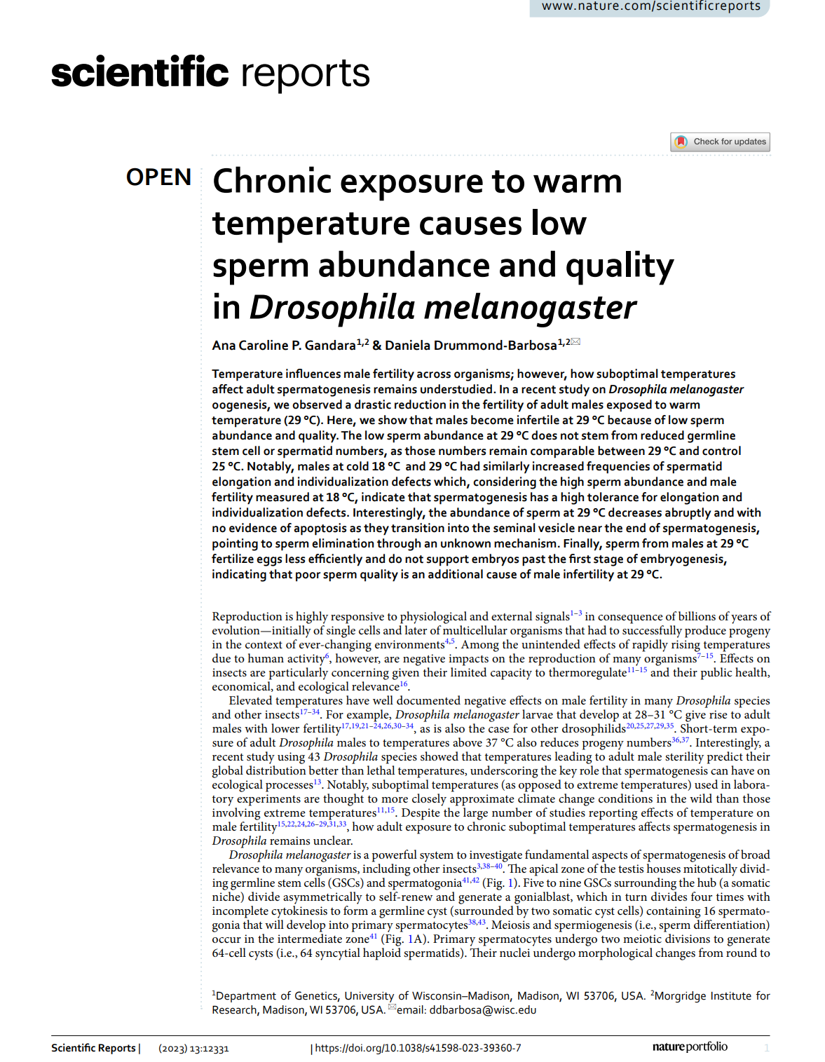 Chronic exposure to warm temperature causes low sperm abundance and quality in Drosophila melanogaster by Ana Caroline Gandara and Daniela Barbosa